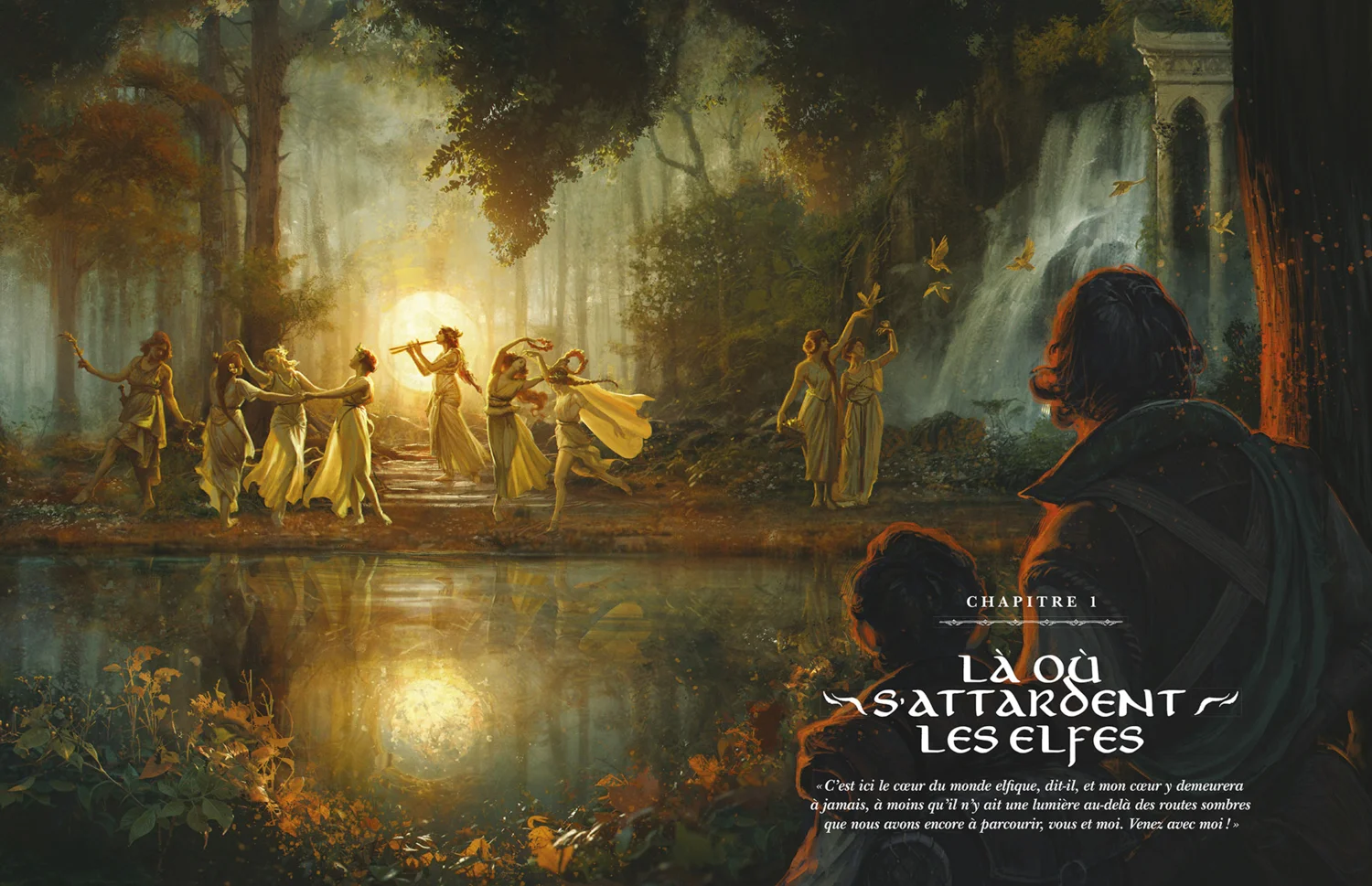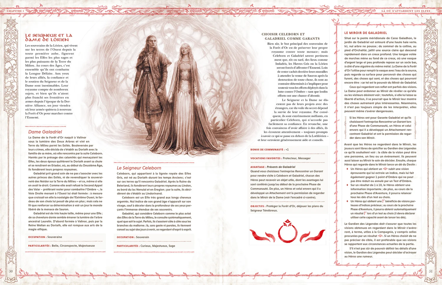 - Le chapitre 1 : Là où s’Attardent les Elfes décrit les royaumes de la Lórien, de Fondcombe et du Lindon, ainsi que leurs habitants et les Seigneurs elfes qui les protègent.